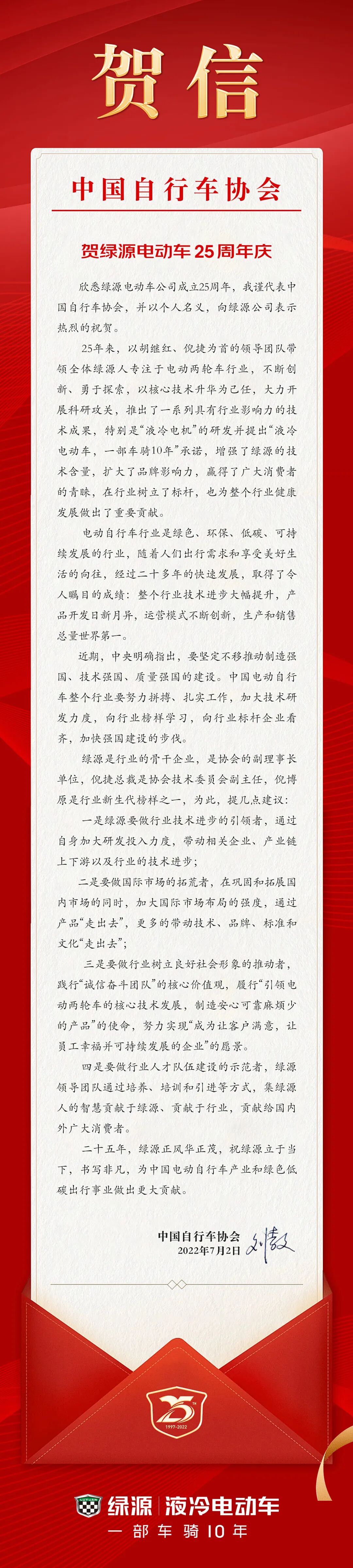 正值绿源成立25周年之际,中国自行车协会刘素文理事长发来贺信,让全体绿源人备受鼓舞。在贺信中,刘理事长不仅对绿源25周年生日表示热烈祝贺,还对绿源人专注两轮电动车行业,不断创新,勇于探索的精神表示认可!对推出一系列如“液冷电机”这样具备行业影响力的技术成果、以及“绿源液冷电动车,一部车骑10年”的新定位表示高度评价!