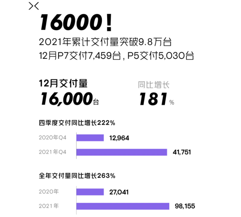 2021年,小鹏汽车在新势力车企中的交付量位居第一,领先蔚来和理想,全年交付量高达98155辆,同比2020年增长了3.6倍,其中小鹏P7全年交付量更是达到了60569辆,占到整体交付量的62%。G3i系列车型全年累计交付量也达到了29721辆,同比增长148%。2021年10月开启规模交付的小鹏P5,在去年12月的交付辆也达到5030辆。