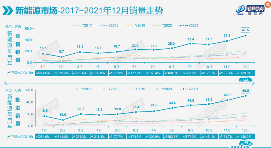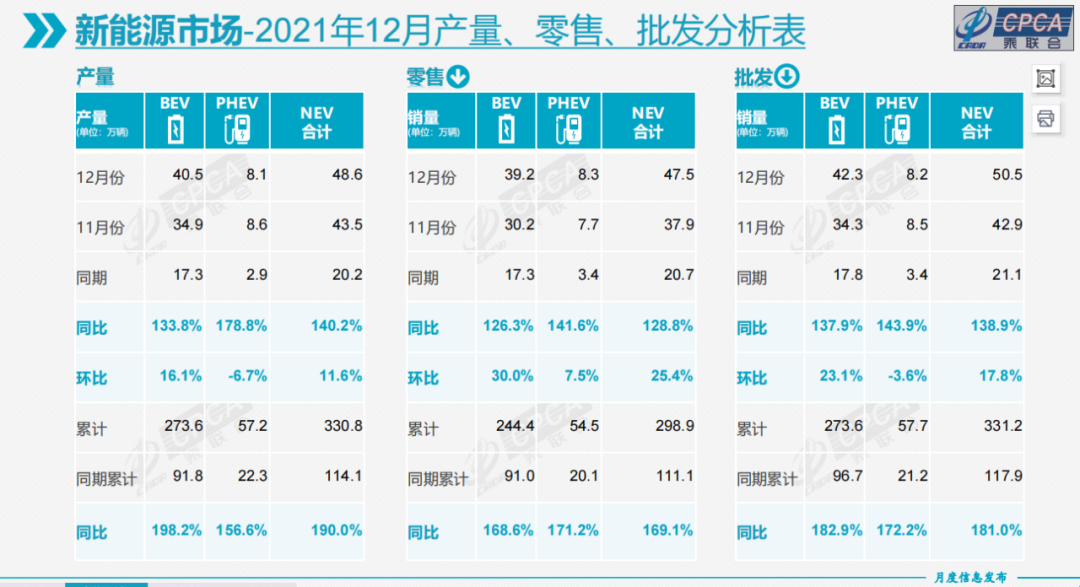 2022年1月11日,乘联会举行12月份的线上发布会,公布了12月份和全年新能源汽车的销量数据,并对2022年市场做了预测。新能源乘用车销量从原来480万辆的预测上调到了550万辆。乘联会数据显示,12月份新能源乘用车批发量达到50.5万辆,同比增长138.9%;全年新能源乘用车批发量达到331.2万辆,同比增长181.0%。12月新能源乘用车零售销量达到47.5万辆,同比增长128.8%,环比增长25.4%;全年零售销量达到298.9万辆,同比增长169.1%。12月新能源汽车厂商批发渗透率达到21.3%,1-12月渗透率为15.7%;零售方面,12月新能源汽车国内零售渗透率为22.6%,1-12月渗透率为14.8%。从乘联会的批发量来看,从8月份开始,新能源乘用车的批发量迈入30万辆的台阶并站稳;在11月份达到42.9万辆后,12月份直接跳高至50万辆。与此对应的零售销量方面,也是在9月份进入到30万辆的级别,12月份也接近50万辆。![]()