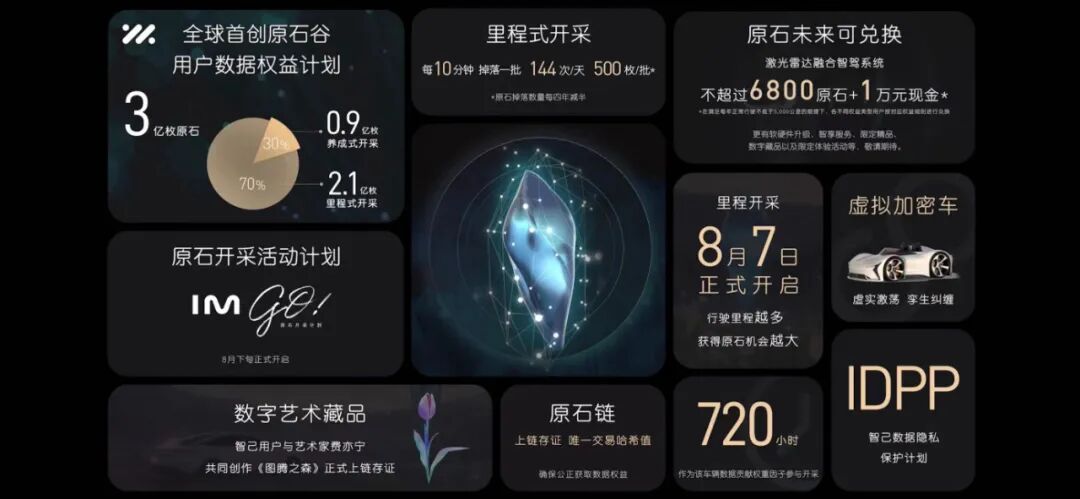 目前,原石中30%为养成式开采,可通过参与APP互动任务、品牌共创任务等获得;而70%为里程式开采,将于8月7日正式开启,通过驾驶智己汽车获得。用户提供的行驶里程数据越多、时间越早,获得原石的机会也越大。