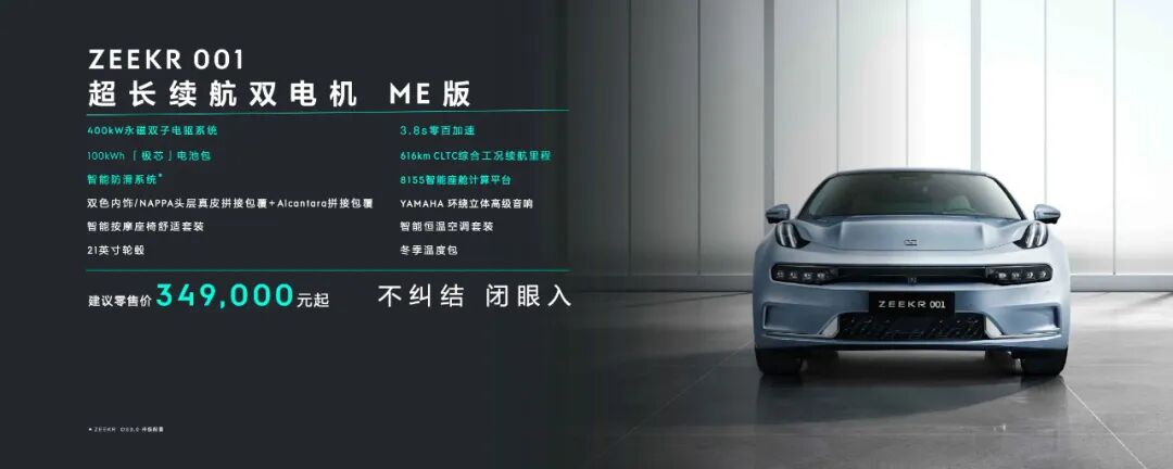 当天,极氪也推出了极氪001超长续航双电机ME版,标配400kW电驱系统和100kWh电池包,0-100km/h加速时间为3.8秒,CLTC续航为616公里,售价34.9万元起。新车提供全时后驱、适时四驱、全时四驱三种驱动模式并搭载闪电切换智能四驱系统,能在0.4秒内实现后驱/四驱的智能切换。