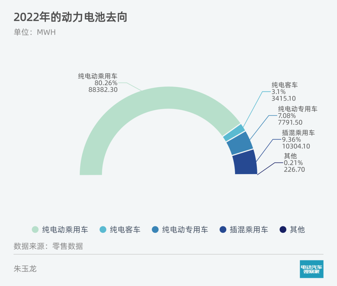 - 纯电动乘用车使用量为88.38GWh,占比超过了80.26%;