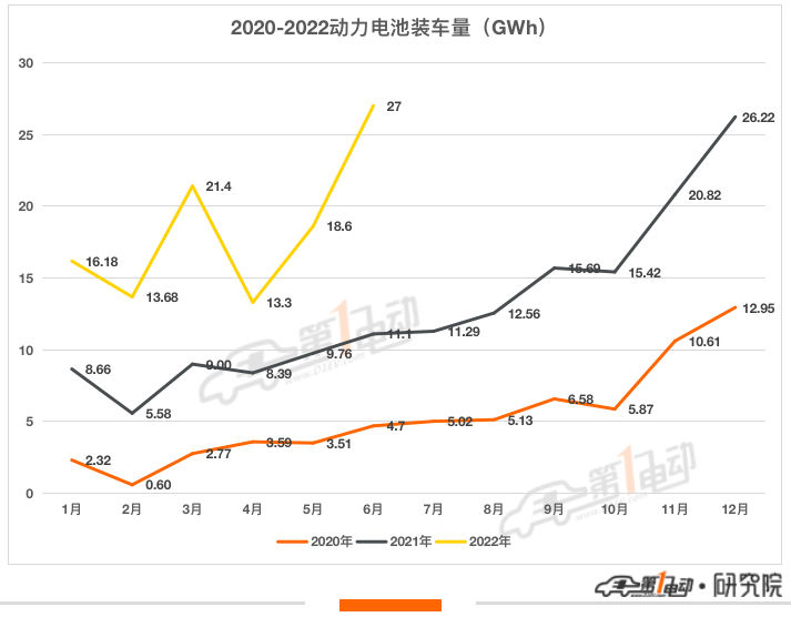 蜂巢能源超越孚能科技位居第八,捷威动力环比下降超50%,排名从5月第十下降至6月第15。环比增幅来看,LG新能源环比暴涨超10倍,瑞浦兰钧环比大涨超一倍,宁德时代、蜂巢能源、塔菲尔环比上涨超50%,与之相反地,捷威动力环比下降超50%,多氟多、力神、中创新航环比均呈现不同程度地下滑。市占率方面,LG新能源市占率提升最高达5.5个百分点,其次是宁德时代市占率提升3.8个百分点,瑞浦兰钧、蜂巢能源、国轩高科均有不同程度地上涨,而比亚迪市占率下降3.4个百分点,中创新航市占率下降2.8个百分点,亿纬锂能、欣旺达、孚能科技、捷威动力、多氟多、力神、鹏辉能源市占率均有不同程度下降。2022上半年,宁德时代仍然是一家独大,占据半壁江山。由于受4月上海疫情影响,比亚迪缩小与宁德时代的差距,但我们预计这种差距是暂时的,下半年宁德时代将再次拉大与比亚迪和其他企业的差距。根据中国汽车动力电池产业创新联盟(简称“电池联盟”)发布的数据,6月我国动力电池装车量27GWh,同比增长143.3%,环比增长45.5%,创历史新高。1-6月,我国动力电池累计装车量110.1GWh,累计同比增长109.8%。6月,我国新能源汽车市场共计37家动力电池企业实现装车配套,较去年同期减少2家。1-6月,我国新能源汽车市场共计45家动力电池企业实现装车配套,较去年同期减少8家。![]()