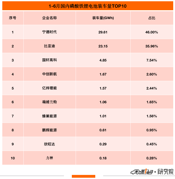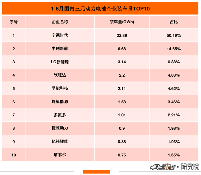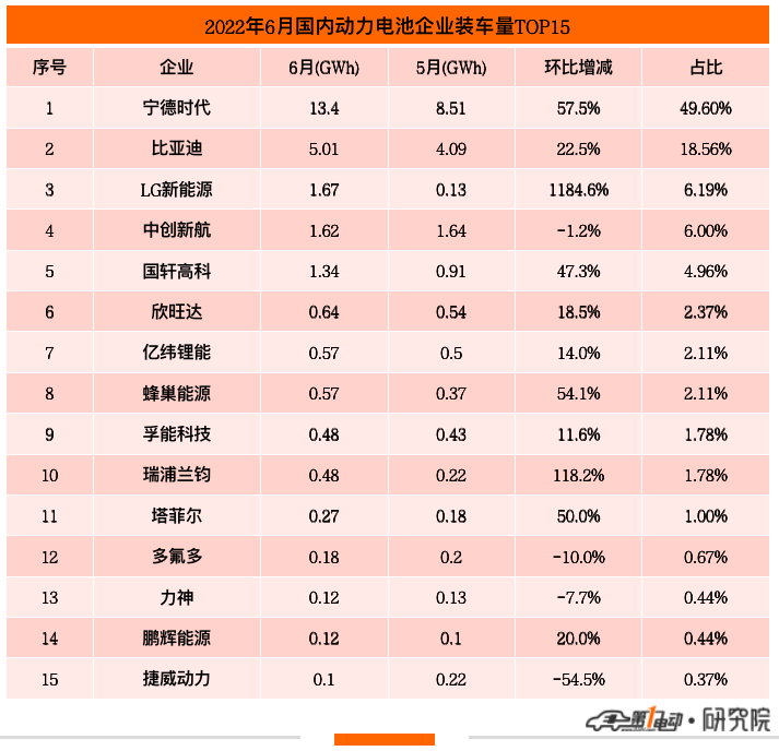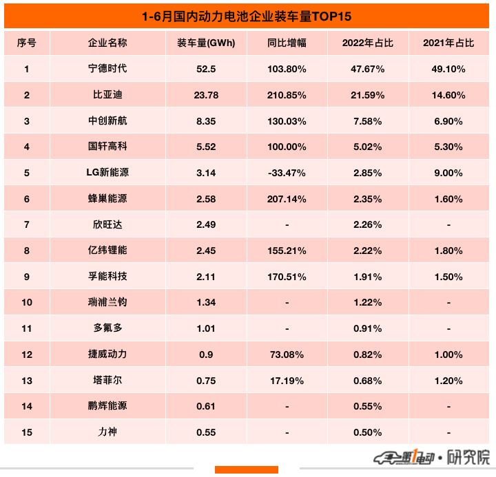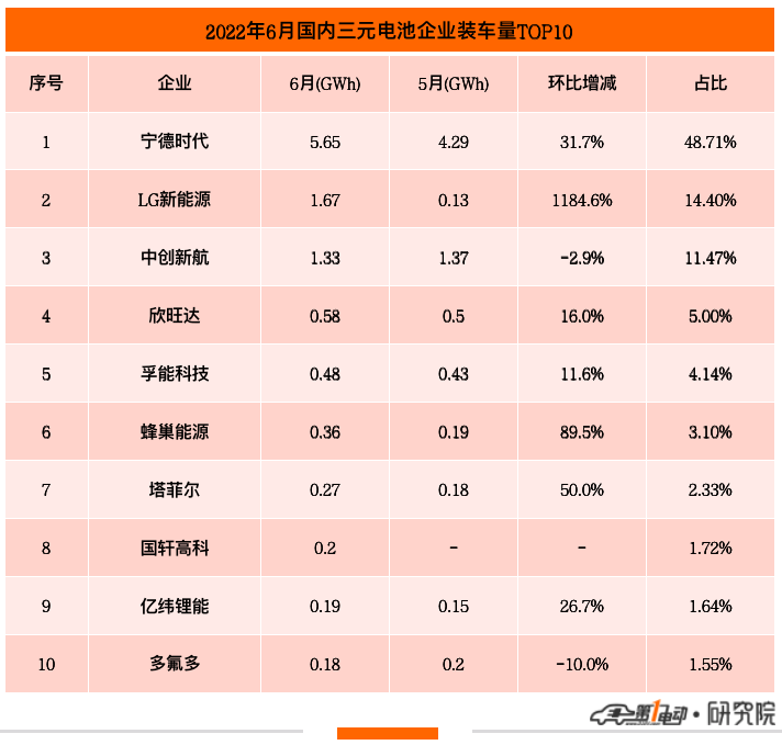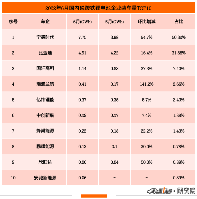 分电池类型来看,6月,三元电池装车量11.6GWh,占总装车量42.9%,同比增长94.9%,环比增长39.4%;磷酸铁锂电池装车量15.4GWh,占总装车量57.1%,同比增长201.5%,环比增长50.7%。1-6月,三元电池累计装车量45.6GWh,占总装车量41.4%,累计同比增长51.2%;磷酸铁锂电池累计装车量64.4GWh,占总装车辆58.5%,累计同比增长189.7%。三元电池领域,宁德时代装车量5.65GWh,环比上涨超30%,占比近50%,位居第一,LG新能源环比暴涨超10倍,排名跃升9位至第二,中创新航下降至第三。多氟多装车量0.18GWh,环比下降10%,排名下降四位至第10;国轩高科再次上榜,位居第八,捷威动力从5月第五跌落榜单。2022上半年,宁德时代一家独大占半壁江山,中创新航位居第二,市占率仅不到15%,LG新能源的市占率仅个位数,排名上升两位跻身第三,欣旺达超越孚能科技位居第四。塔菲尔再次上榜,比亚迪跌落榜单。磷酸铁锂电池领域,最大的一个变化是,继比亚迪4月、5月连续两个月夺冠后,6月宁德时代装车量7.75GWh,环比上涨94.7%,再次超越比亚迪成为冠军,比亚迪、国轩高科紧随其后。瑞浦兰钧环比上涨超一倍,排名上升3位至第四。受益于长安、东风旗下车型的大卖,安驰新能源今年首上榜跻身第10,而力神被挤出榜单。2022上半年,宁德时代、比亚迪、国轩高科是磷酸铁锂电池领域的前三甲,其中宁德时代市占率提升1.3个百分点,而比亚迪却下降1.3个百分点。瑞浦兰钧超越蜂巢能源位居第六。宁德时代+比亚迪的市占率达81.96%,剩下数十家企业争抢不到20%的市场份额。总体来看,2022上半年,宁德时代依然占据半壁江山,比亚迪占比超20%,而剩下不到30%的市场份额被43家企业争抢,市场竞争激烈程度可想而知。可以预见的是,若不出意外,2022年的冠亚军依然是宁德时代和比亚迪。中创新航能否保住第三的位置,LG新能源能否再次进入前三,蜂巢能源能否进入前五,又会有哪匹“黑马”出现,我们敬请期待。![]()