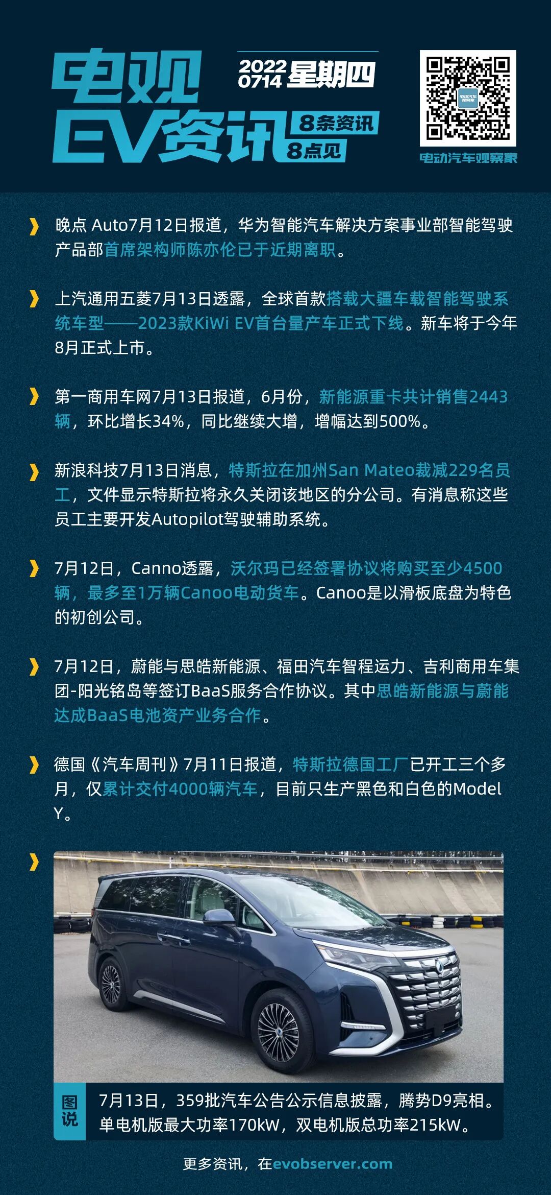 7月13日,359批汽车公告公示信息披露,腾势D9亮相。单电机版最大功率170kW,双电机版总功率215kW。