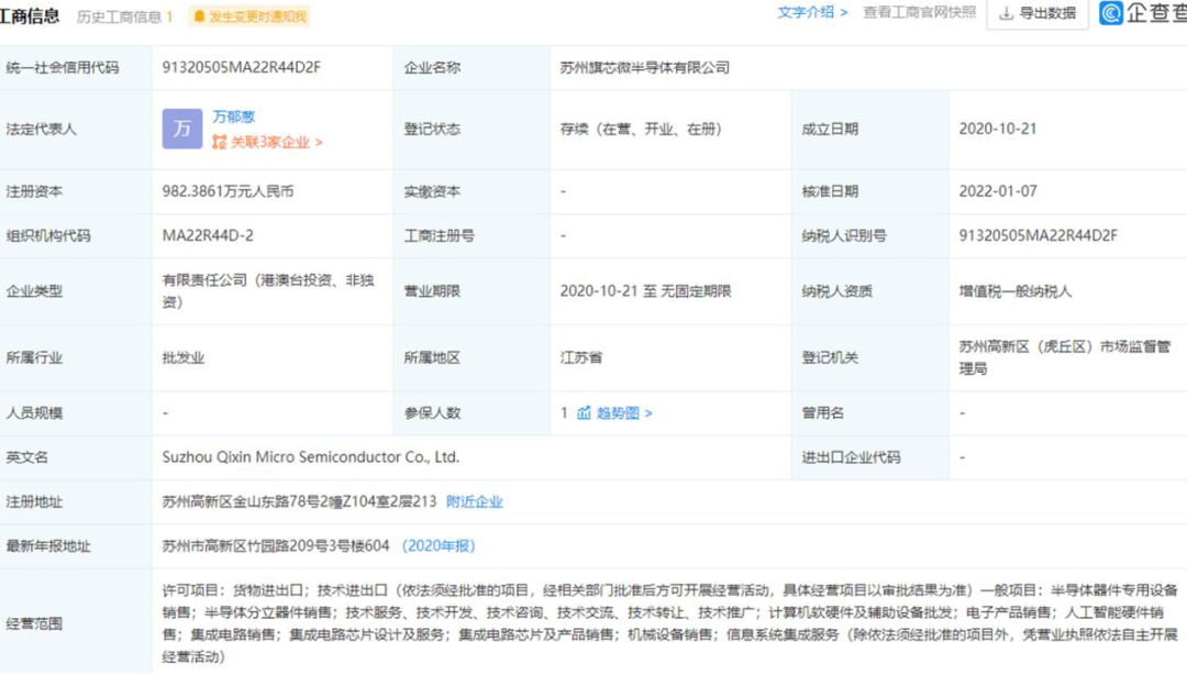 日前,苏州旗芯微半导体有限公司发生工商变更,新增小米关联公司,公司注册资本增至约982.39万人民币。