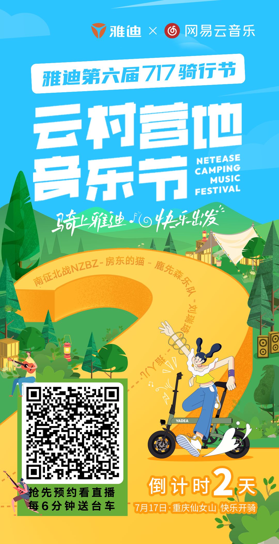 7月17日,令全球电动两轮出行领域沸腾的第六届雅迪717骑行节将盛大开幕,扫描下图二维码即可预约直播,骑上雅迪 快乐出发!