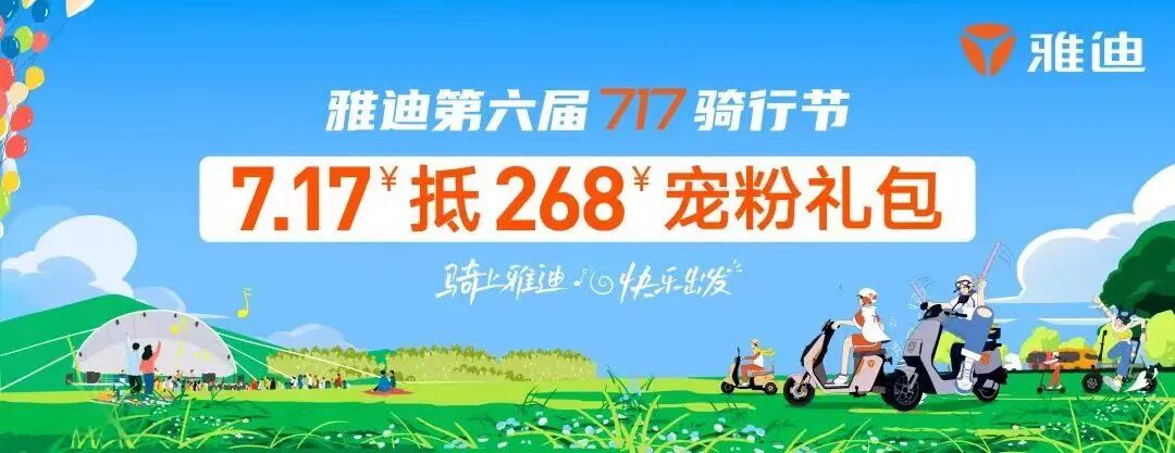 当然,雅迪717骑行节关键角色——包括雅迪冠能3在内的全品类产品也将如期而至。届时,科技与音乐的碰撞将迸发怎样耀眼的火花?无疑令人期待!特别一提的是,717当日,雅迪将在官方视频号直播间送出71台电动车,717份超宠好礼。同时,雅迪放送7.17元购268元宠粉礼包,电池抵用券、购车券、服务包等钜惠福利。线上线下完美联动,强势赋能终端,新一轮“雅迪”式热销狂潮即将来袭!
