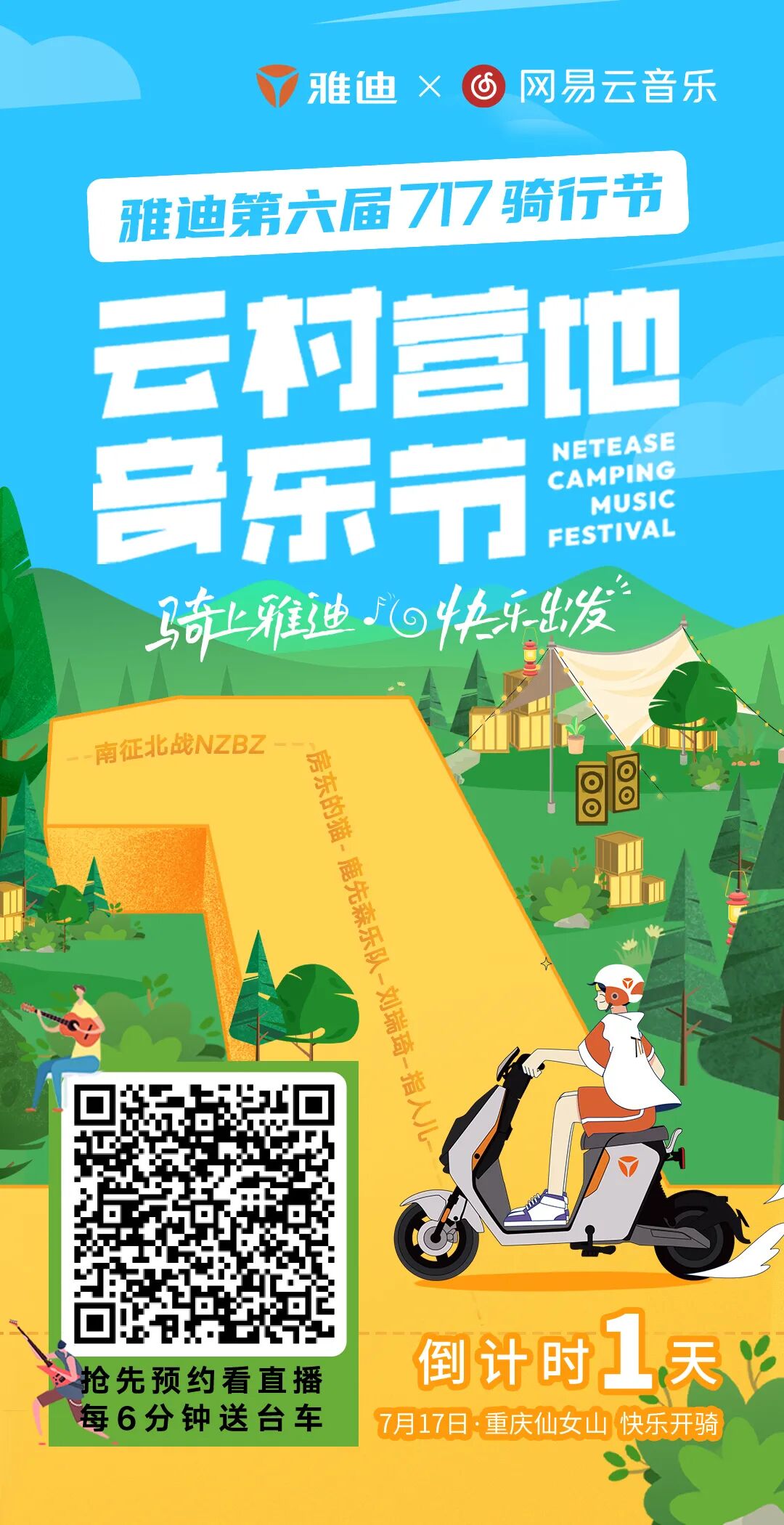 业界认为,雅迪与网易云音乐联手堪称范本级跨界营销案例。不同赛道领航者携手,占据声量优势可谓易如反掌。此外,雅迪与网易云音乐均深受Z世代人群青睐,基于用户群体的高度契合而实现的流量池共享,将有力推动双方品牌价值的裂变式传播。毫无疑问,玩转跨界营销的雅迪博得了更多年轻用户的青睐,而借势品牌价值在年轻圈层中深度延展,雅迪将不断提速品牌年轻化进程,以此锻造久盛不衰的竞争力。既是雅迪出手,必然亮点满满!本次雅迪717骑行节大本营设在国家5A级景区武隆仙女山,气候凉爽、风景如画,在这个燥热的夏天,以宠粉著称的雅迪将为用户献上一场清凉畅快的骑行盛宴!而本次营地音乐节的嘉宾更大有来头。南征北战NZBZ、房东的猫等多个乐队和音乐人将齐聚仙女山,与用户玩转流行音乐,纵享夏日狂欢。同时,雅迪为用户准备了创意手工DIY、非洲鼓现场教学等趣味活动,将专属年轻人的快乐进行到底!