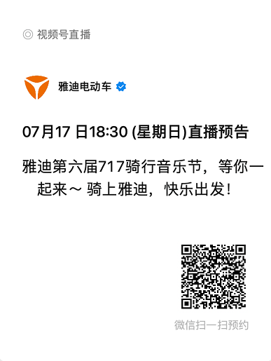 第六届雅迪717骑行节再度让电动骑行文化风靡全球。而雅迪让Z世代享受美好出行,拉通线上线下的创新营销路径,一方面强化品牌势能,另一方面助力全国终端实现销量爆发,更将引领两轮电动行业的年轻化、跨越式发展!7月17日18:30,让我们共同见证一场由雅迪精心“谋划”的大狂欢!扫描下方二维码预约直播,跟随雅迪探索无限骑行乐趣吧! 推 荐 阅 读