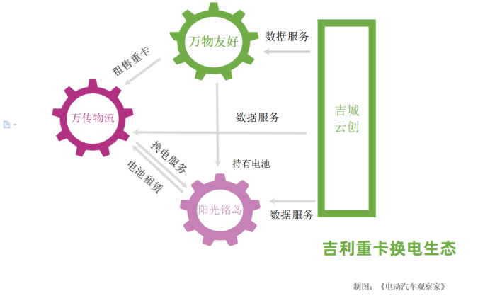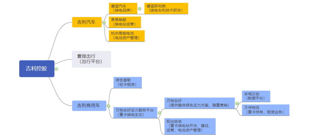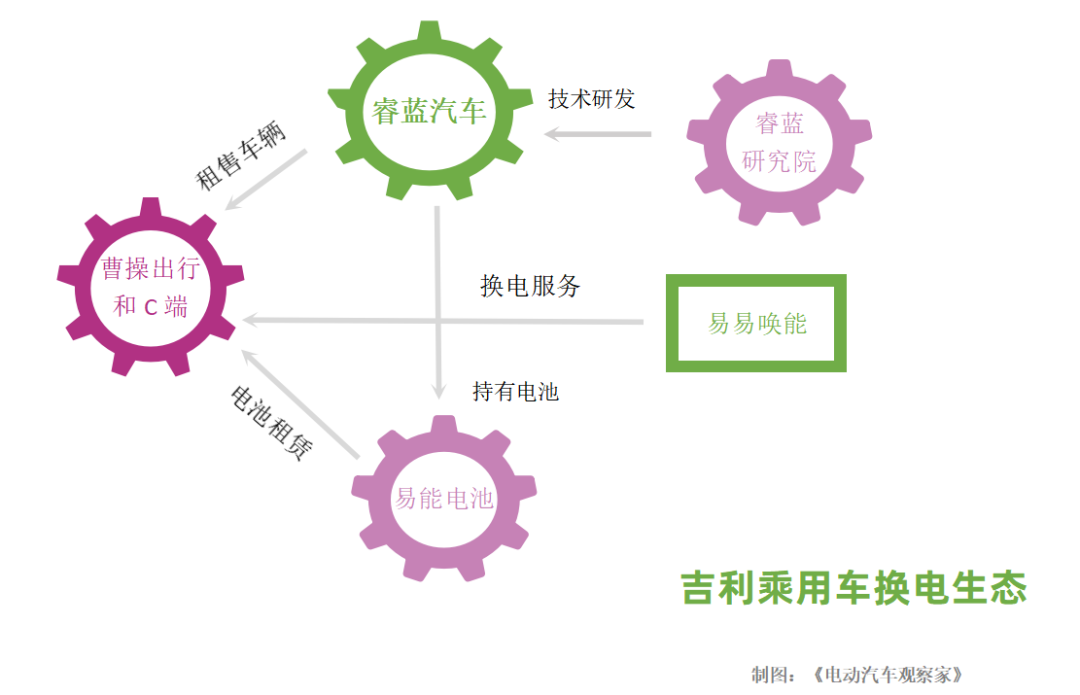 乘用车方面,主要是睿蓝作为换电品牌,易易唤能(易易互联科技有限公司)负责换电站的运营,杭州易能电池管理技术有限公司负责电池资产管理。睿蓝汽车销售公司副总经理陈高旭告诉《电动汽车观察家》,从层级来说,睿蓝汽车、易易唤能和易能电池属于同级别的企业,但是目前易易唤能由睿蓝汽车董事长兼CEO娄源发监管,并统一向上汇报;易能电池独立向集团汇报。曹操出行独立于吉利汽车,但其换电车辆都是由睿蓝提供。今年4月13日,睿蓝汽车与曹操出行签署长期合作协议。根据协议,在未来几年内,曹操出行将大批量采购睿蓝汽车生产的定制车,投入共享出行领域。商用车领域也类似。吉利商用车旗下“万物友好运力服务平台”负责商用车换电生态的整体搭建,由万物友好运力科技有限公司和阳光铭岛能源科技有限公司两大核心版块组成。其中万物友好目前侧重于换电重卡营销、市场推广;阳光铭岛侧重重卡能源生态领域的产业布局和规划,换电站运营,以及电池资产管理,为客户提供定制化服务。![]()