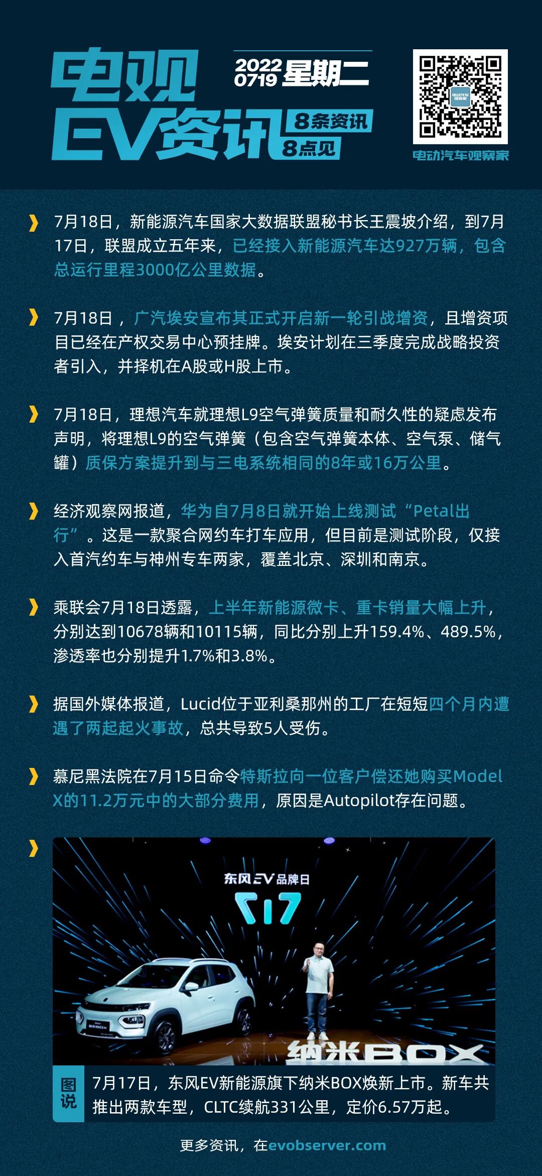 7月18日,新能源汽车国家大数据联盟秘书长王震坡介绍,到7月17日,联盟成立五年来,已经接入新能源汽车达927万辆,包含总运行里程3000亿公里数据。