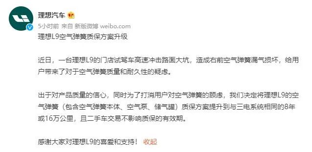 同时,针对此事,理想汽车官方宣布,出于对产品质量的信心,同时为了打消用户对空气弹簧的顾虑,理想汽车决定将理想L9的空气弹簧(包含空气弹簧本体、空气泵、储气罐)质保方案提升到与三电系统相同的8年或16万公里,且二手车交易不影响质保的有效期。