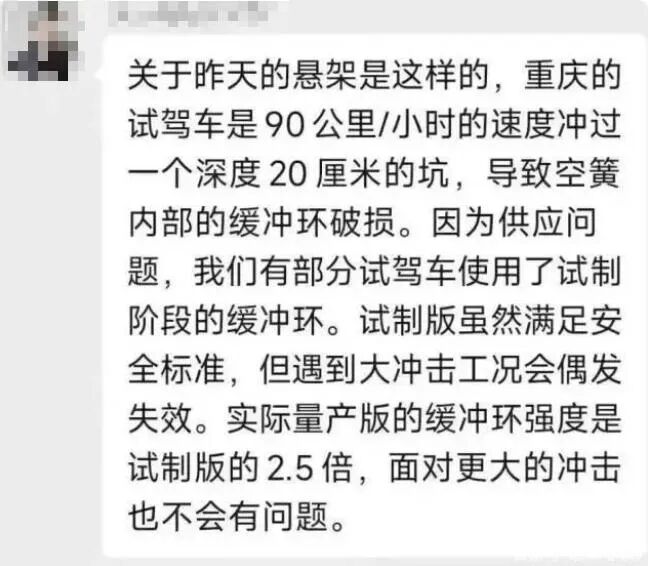 对于“部分试驾车使用了试制阶段的缓冲环”的解释,该负责人更不认同,他表示,首先要搞清“试制车”和“试驾车”的概念,试制是量产车的“草稿”,一般情况下绝不会对外公开,且只能取得临时牌照进行测试工作等;而试驾车则属于量产车,可正常办理牌照。