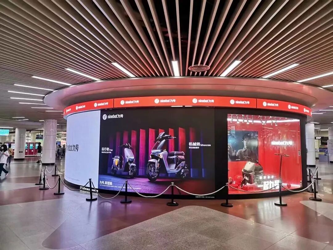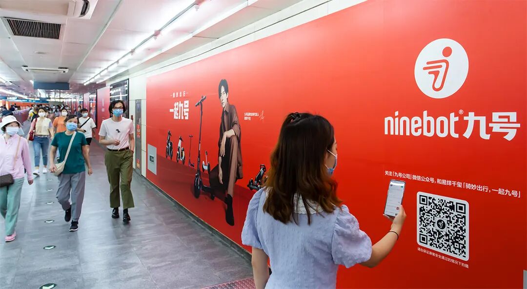 在一二线城市、新一线城市和省会城市,市中心核心商圈滚动播放品牌宣传视频、小区和写字楼的电梯间内也出行“骑妙出行,一起九号”宣传海报,为线下门店精准地吸引了大量年轻消费者。