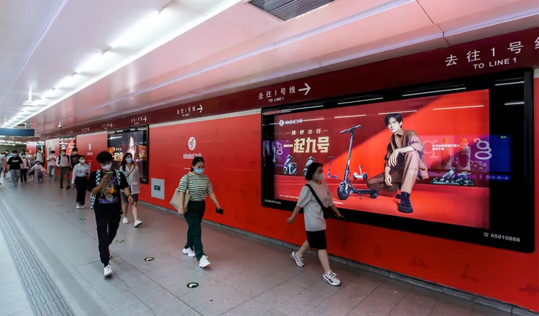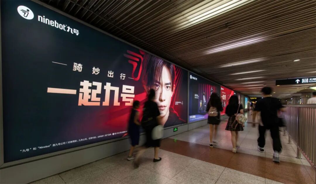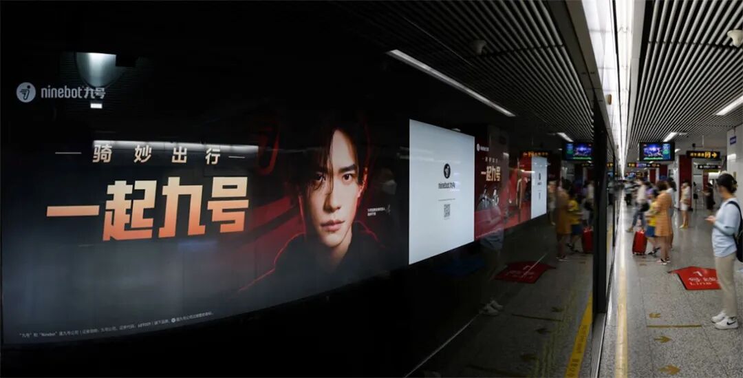 线上线下展开全方位广告投放矩阵,以年轻人熟悉的场景为沟通点,从一线大城市热门商圈,人潮汹涌的地铁站,再到小区和写字楼的电梯间,乃至手机里的微信朋友圈,微博热搜,小红书/QQ音乐等APP的开屏画面,年轻用户的目光投向哪里,九号的品牌形象就在哪里——“骑妙出行,一起九号”的口号也在响彻全国。