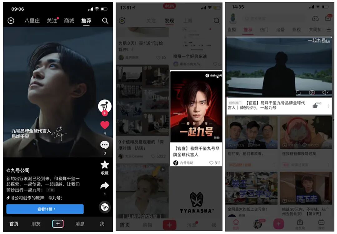 继今年7月初,正式官宣易烊千玺成为品牌全球代言人后,九号高调地开启了此次品牌升级战的大规模投放。顶级资源流量和宣传阵地+铺天盖地的高密度宣传阵势——九号近期的广告投入力度之大、落地之快、覆盖范围之广,在行业内绝无仅有。