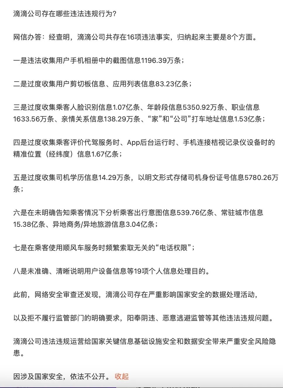 7月21日,国家网信办对滴滴处人民币80.26亿元罚款,对滴滴董事长兼CEO程维、总裁柳青各处人民币100万元罚款。在随后的相关问答中,网信办也对具体滴滴的违法相关信息进行了说明和介绍。