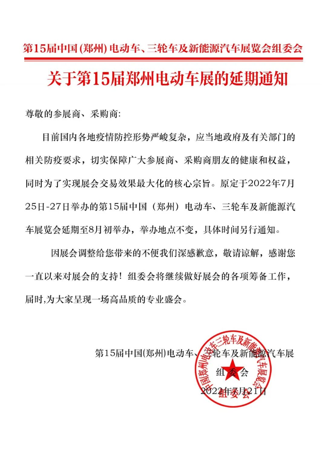 接郑州市卫健委紧急通知,原定7月25日举办的郑州电动车展将延期至8月举办