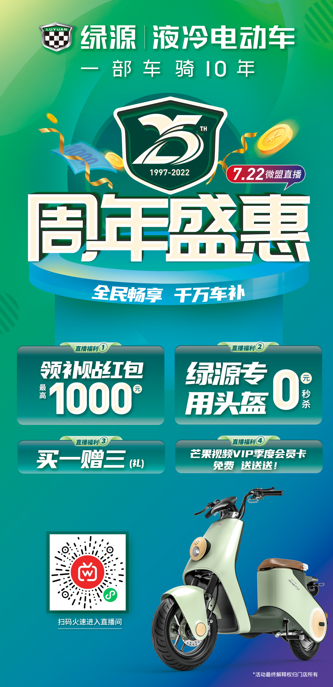 绿源周年盛惠直播间火爆预约中致敬百万车主超级盛宴 周年狂欢“价”势十足!多重“豪”礼钜惠不是天天有 该出手时就出手直播时间:7月22日(本周五)下午2点