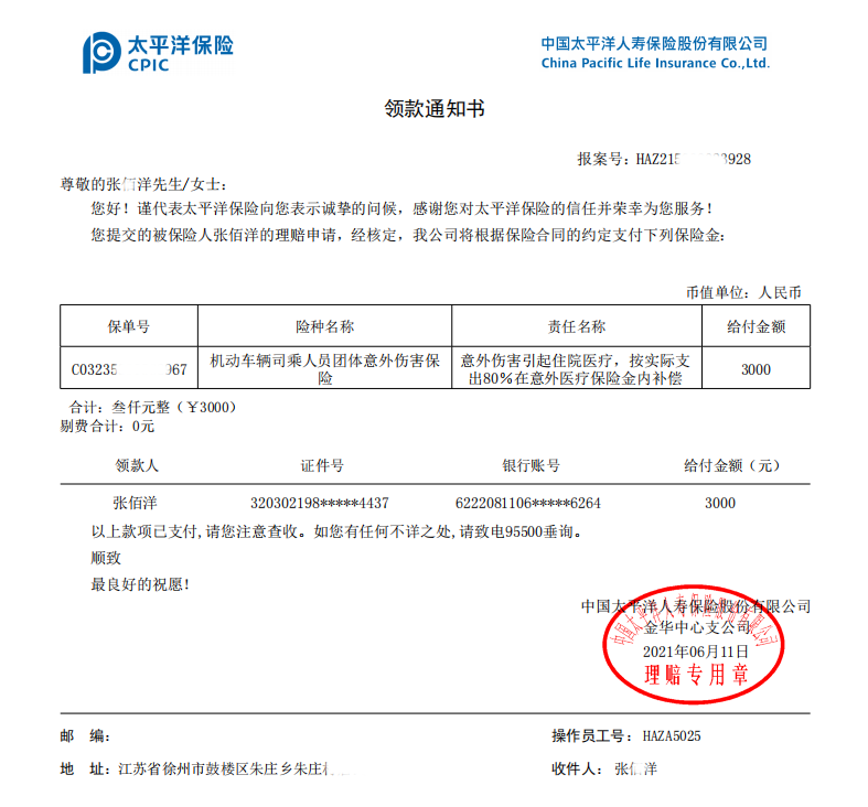 同年,江苏徐州的张*洋先生,骑行电动车时发生事故,受轻伤。由于张先生在购车时已办理绿源车主保障计划,因此他和前述案例中的林女士一样,收到赔付3000元。