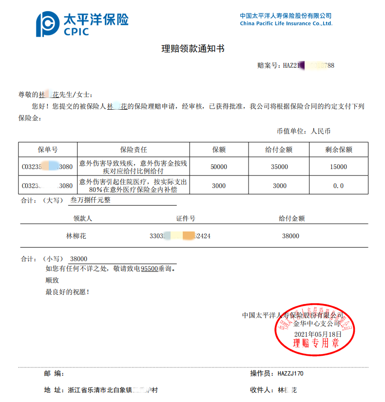 2019年11月,浙江省乐清市,林*花女士骑行电动自行车,与一货车发生事故。林女士因此受伤。由于林女士在购车时已办理绿源车主保障计划,经审核,由中国太平洋人寿保险股份有限公司赔付38000元。