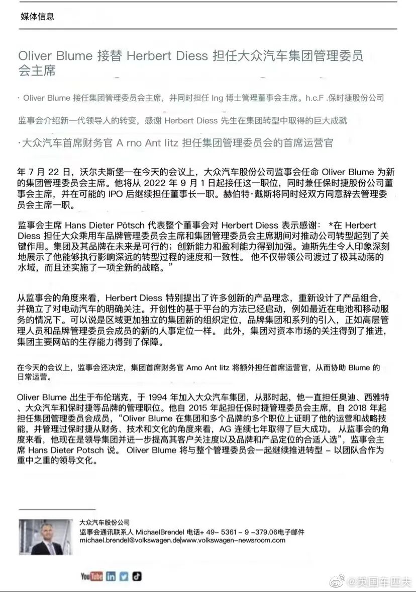 7月22日,大众集团宣布,赫伯特·迪斯将卸任大众集团CEO,现任保时捷CEO奥利弗布鲁姆(Oliver Blume)接任。新的人事任命将于2022年9月1日起实行。
