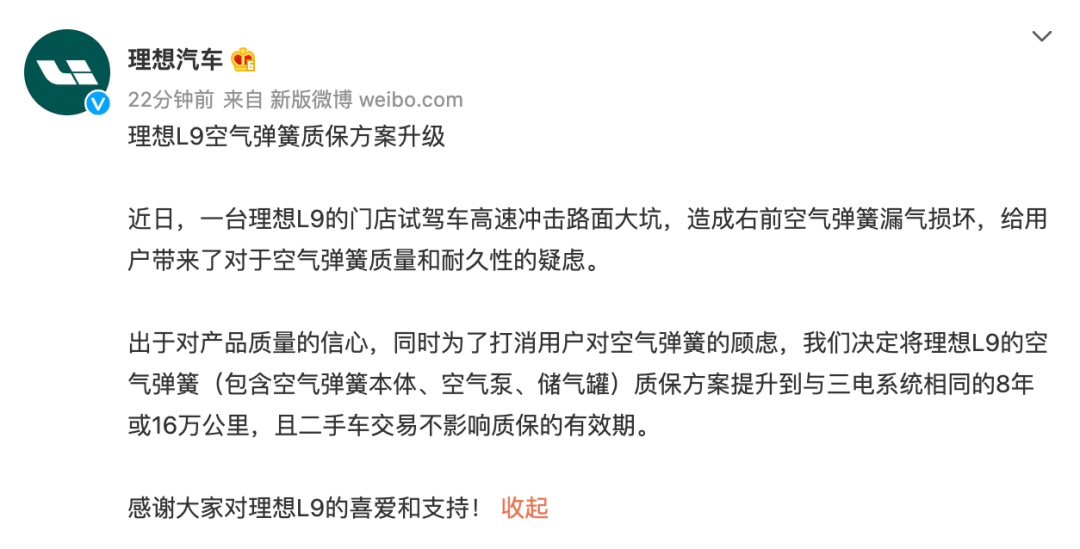 近日,理想试驾车空气悬架疑似断裂一事引发了多位用户对L9空气弹簧可靠性的质疑。由此,理想汽车官微在7月18日发布了“理想L9空气弹簧质保方案升级”。将理想L9的空气弹簧(包含空气弹簧本体、空气泵、储气罐)质保方案提升到与三电系统相同的8年或16万公里,且二手车交易不影响质保的有效期。