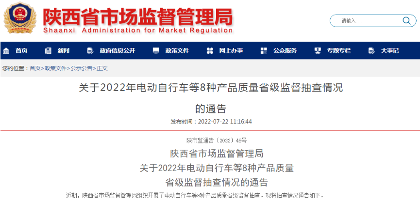2022年7月22日,陕西省市场监督管理局网站发布关于2022年电动自行车等8种产品质量省级监督抽查情况的通告。