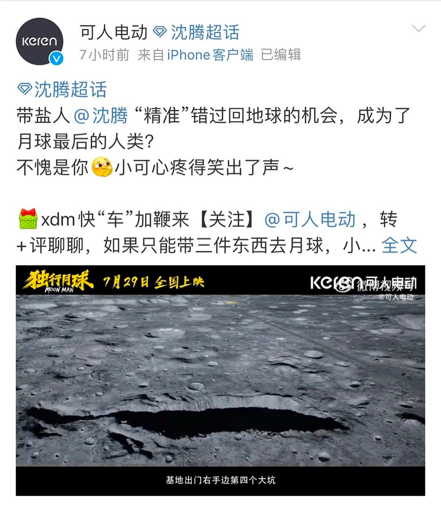 作为可人电动的签约代言人,沈腾的话题流量自然不可小觑,而可人电动也紧抓潮流热点,合作《独行月球》,授权成为影片官方合作伙伴,为代言人助力打call!并在微博送出独家福利,关注并@可人电动,转发+评论最新微博,抽取“幸运鹅”送出电影票,这一波福利操作,果然很“可人”!