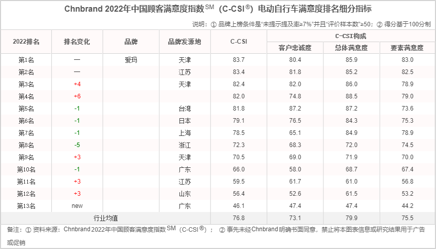 本年度C-CSI调查,品类样本量总计超过 278万个,调查覆盖 178个细分行业,涉及被评价主流品牌 10,748 余个,C-CSI平均得分79.7分,爱玛以83.7分的优异成绩赢得电动车行业消费者满意度第一名,成为其中的典型代表。