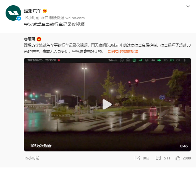 当日,理想汽车官方微博转发员工微博对理想L9试驾车被曝发生断轴一事进行了回应,并且公布理想L9宁波试驾车事故行车记录仪视频,“雨天夜间以86km/h的速度撞击金属护栏,撞击损坏了超过30米的护栏,事故无人员受伤,空气弹簧完好无损。”