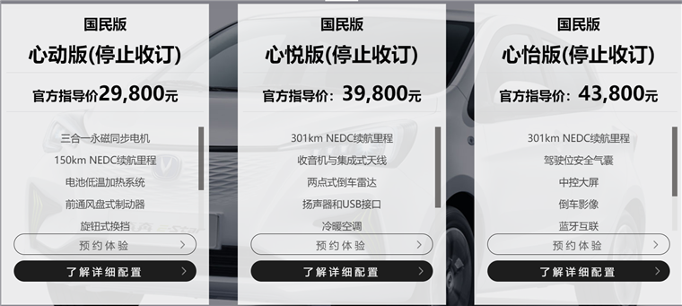 工况续航301公里,指导价2.98万元起,这样的价格在同级别车型当中的竞争力确实很强。据长安新能源官网显示,目前奔奔E-star国民版车型中的心动版、心悦版、心怡版三款车型显示已“停止收订”。
