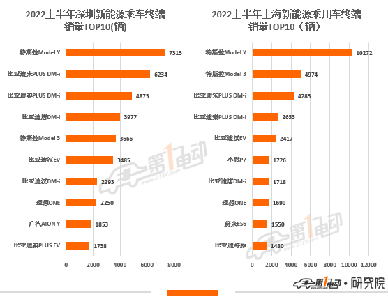 根据公安部上险量数据,上海在经历疫情“销量深渊”后,6月终端销量已迅速“回暖”,环比暴涨16倍,再次超越深圳夺得冠军。深圳终端销量超2.1万辆,环比上涨55%,位居第二,杭州终端销量1.9万辆,环比上涨67.7%,位居第三。得益于5月26日“放标”超7万个,北京6月实现终端销量1.77万辆,环比大涨110%,超过广州位居第四。随着疫情的有效控制,预计今年下半年北京的终端销量将持续高涨。曾在5月位居第三的成都,终端销量超1.5万辆,排名下降两位至第五。曾在5月位居第八的天津和位居第10的西安,被上海和南京挤出前十。南京终端销量9,145辆,环比上涨超70%,排名上升三位至第10。环比增幅来看,TOP20城市的终端销量均实现环比超20%的增长,其中上海增幅最大超16倍,其次是北京市环比增长超1倍,苏州、郑州、青岛环比增长超80%,南京、温州、宁波、杭州、深圳、成都、武汉、东莞环比增长超50%。今年上半年,城市新能源乘用车终端销量TOP20发生巨大变化。深圳超越上海夺得冠军,上海由于4月、5月受到疫情影响,终端销量同比下降了23%,位居第二,杭州稳居第三。得益于特斯拉Model Y、Model 3和宋PLUS DM-i等车型的热销,成都超越北京、广州同比增长超1倍,位居第四。北京被成都挤出前五,广州稳居第五。佛山终端销量超4万辆,环比暴涨超4倍,跃升至第10。佛山销量的暴涨主要得益于小鹏P7、宏光MINIEV和特斯拉Model Y终端销量的大涨,再加上佛山市政府发布了促进汽车消费的补贴政策。从榜单后十位来看,曾在去年同期位居第18、第19和第20的洛阳、海口、南宁落榜,取而代之的是无锡、东莞、合肥。深圳私人市场最畅销车型是特斯拉Model Y,在最畅销TOP10车型中,除了特斯拉的两款车型、广汽AION Y和理想ONE外,其余均是比亚迪的车型。特斯拉Model Y、Model 3和宋PLUS DM-i是上海私人市场最畅销的三款车型。特斯拉Model Y、广汽埃安Y和宋PLUS DM-i是广州消费者最受欢迎的三款车型;特斯拉Model Y、Model 3和理想ONE是杭州消费者最受欢迎的车型。特斯拉Model Y同样是成都和北京消费者最受欢迎车型,从两个城市的TOP10车型来看,放眼望去,满眼都是比亚迪车型。郑州消费者最受欢迎的三款车型是宏光MINI、特斯拉Model Y和理想ONE;而小鹏P7、宏光MINI和小鹏P5是佛山市民的最爱。特斯拉Model Y同样也是重庆市民的最爱,而天津市民最受欢迎车型是秦PLUS DM-i,其次是宋PLUS DM-i和特斯拉Model Y。![]()