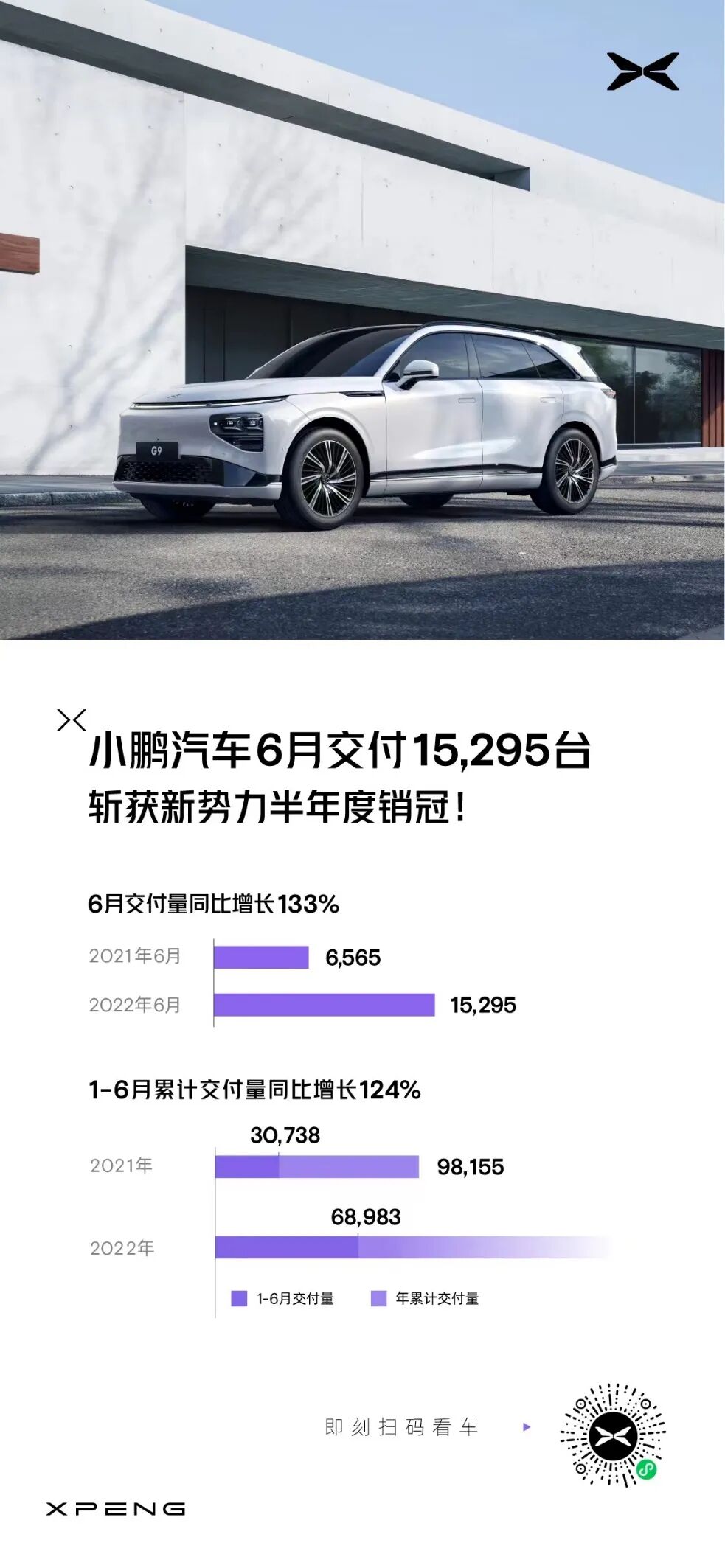 。但随着原材料价格不断上涨,零跑今年已经调价好几次。如何在保有车辆竞争力的同时保证车型利润率,始终是零跑的一大问题。尤其是主打性价比的零跑T03,已经很难抗住原材料价格上涨带来的成本压力了。如此看来,性价比小车会逐渐往10万元价位的高端靠拢,而以往做小车的新能源车企转型智能电动车,也就成了必然。小鹏汽车6月交付量为11524台,1-7月累计交付量为80507台。上个月的销冠小鹏本月下滑到第三位,甚至还被曝出部分门店以降价换销量的消息,似乎日子有些不太好过。但好在下半年的重磅车型小鹏G9即将上市,这是很多车友期待的一款车型,是否真能像何小鹏所说成为50万内最好的SUV虽然还无法盖棺定论,但大概率能给小鹏接下来的销量带来直观上的提升。不过在这里提醒一下小鹏,搭载800V超高压快充平台的小鹏G9宣称充电5分钟、续航200公里,但配套的超充桩也得抓紧时间大规模落地啊,可别让车主们“望桩兴叹”了