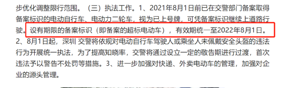 深圳在2021年发布的《深圳市电动自行车管理规定(试行)》,该规定明确了原来定于2021年12月31日到期的超标电动自行车(黄牌)将自动延期到2022年8月1日,在该规定之前购买的电动自行车未登记的,应该在规定期限内向市公安交管部门申请登记,符合规定的发放行驶证、号牌和电子登记证,不符合规定的发放过渡期标识。