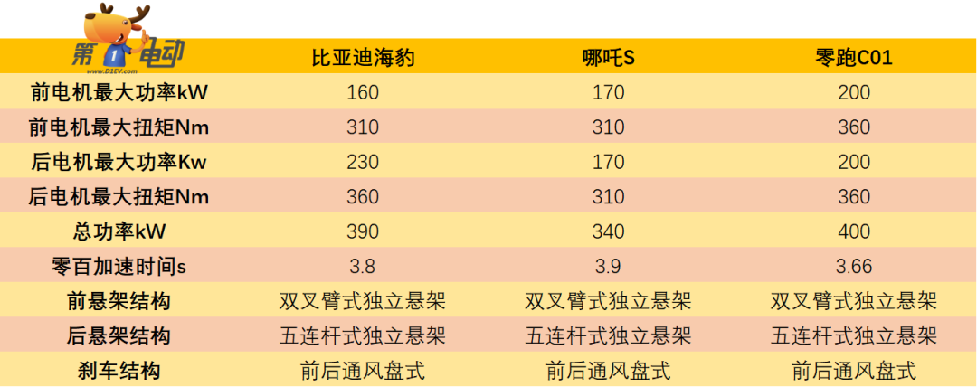 既然是主打性能的车型,那么自然这3款车型都是前后双电机版本,不过他们的电机功率、扭矩都略有不同。账面数据最强的是零跑C01,其前后都搭载了200kW的永磁/同步电机,总功率高达400kW,总扭矩720Nm,得益于如此夸张的动力数据,百公里加速度仅需要3.66秒。排行第二的是海豹,它搭载了前160kW的交流/异步电机和230kW的后永磁/同步电机,总功率为390kW,最大扭矩670nM,零百加速时间3.8秒同样排行第二。排名第三的是哪吒S,其前后搭载的是170kW的永磁/同步电机,总功率340kW,总扭矩620Nm,零百加速时间比海豹慢了0.1S,3.9S即可破百。如果你对于三点几秒零百加速没有概念,那么小编告诉你一组油车数据,售价153万元的3.0T保时捷911,零百加速需要4.4S。售价146万元的4.0L奔驰AMG GT,百公里加速度也需要4秒左右。换句话说,你现在花了保时捷、奔驰跑车的一个零头都不到的价格,零百加速就能超越它们,可想这3款电动车的加速性能是如何的狂暴。在悬架和刹车配置方面,三款车出奇的采用了相同配置,全部为前双叉臂后五连杆独立悬架,前后通风盘式刹车,刹车卡钳也都没有采用品牌工厂代工产品。在硬件相同的情况下,这3款车的驾驶表现就更多的依靠于自身车企的调校功底,具体表现如何还要等实车驾乘体验后才能对比。