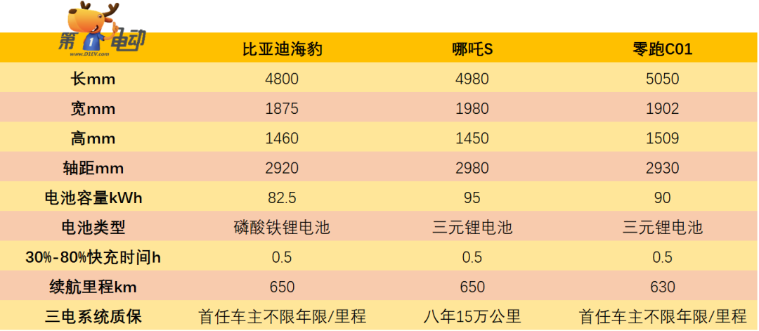 从这3款车的配置表中我们可以发现,这3款车其实配置基本相差无几,3者均为配备激光雷达,都只采用了毫米波雷达+超声波雷达+摄像头的智驾硬件体系,智能辅助驾驶方面目前都能实现L2级自动驾驶辅助功能。3车都配备了好用的智能互联系统,不过通过实车体验来看由于零跑C01和哪吒S都使用了高通8155智舱芯片,车机使用方面都较为流畅,反观海豹貌似只使用了骁龙690芯片,在地图导航操作上有略微卡顿现象。对比完3款车型的账面数据,我们再来一一分析3款车的独特黑科技以及适合的目标人群,看看哪款车是你的菜。CTB电池车身一体化技术是在比亚迪海豹宣传时反复提到的“黑科技”。所谓CTB电池车身一体化技术,即将电池上盖与车身地板“合二为一”,让动力电池成为整车的结构件,来进一步简化车身结构和生产工艺。得益于车身与电池系统的高度融合,搭载CTB技术的海豹,车身扭转刚度可以达到40500N·m/°。iTAC智能扭矩控制技术可以理解为车身稳定系统(ESP)的四驱前置升级版,或者是牵引力控制系统(TCS)的再升级版。得益于在轮速传感器的基础上增加了电机旋变传感器,iTAC的精度更高,甚至可以结合车身状态实现提前控制。不仅仅可以在冰雪等低附着力路面实现更好的安全性,同时可以提升弯道的操控极限。目标人群:比亚迪海豹在3款车型中尺寸最小,但是无论是电机功率还是加速性能都毫不逊色于其他2台车型,加之海豹4驱版车型还额外提供运动套件选装包,因此小编认为海豹的目标用户主要是那些追求运动驾驶的年轻人,海豹正式比亚迪为了喜好运动驾驶年轻人打造的专属纯电动轿跑车型。“天工电池”实现了电芯、模组、整包的三级防护,能提供电芯间 1000℃的隔热、模组的 800V 电气绝缘、IP68 级别的整包防水等安全功能,有效控制热扩散、绝缘损坏等安全问题。此外,哪吒汽车自研的 HOZONEPT4.0 恒温热管理系统,凭借前馈控制、行车加热等功能,可增加 20% 的冬季续航、减少 2% 的充电能耗、提升 20% 的低温充电效率。哪吒S的双电机设计,加上在底盘上均匀分布的电池动力模块,不仅让车辆实现450mm低重心,也为哪吒S带来了50:50的前后配重,这些都能够满足使用的平稳性和驾驶的顺畅、舒适性。另外,哪吒S拥有极佳的车身比例,大车轮、长车颈、长轴距、宽车肩,实现同级最高宽高比1.36,完美展示跑车性感身材,为车主带来超越同级的跑车级操纵体验。哪吒S目标人群定位为乐享体验青年中产及富裕家庭个性青年是核心人群。他们以男性为主,乐观开朗、有主见、重品质、家庭为重、爱运动、看重人际交往,同时他们在对车辆的选择上更看重产品的性能和智能交互体验。运动、性能。为此哪吒汽车将哪吒S打造成为了一款极致的运动轿跑。零跑C01搭载全球首发“无电池包”CTC技术,实现车身整体扭转刚性提升25%,轻量化系数提升20%,综合工况续航提升10%,同时超过30项的严苛试验,确保技术可靠安全,其中8项试验远超国家标准,实现硬件与软件层面的创新突破。零跑C01搭载业界首款可变架构油冷电驱。与其他风冷水冷技术方案相比,油冷电驱总成将电机、减速器、控制器高度集成,前后双油冷电驱最大输出功率400kW,最大输出扭矩720N·m,总成最高效率≥94.6%,NEDC综合效率≥88.5%,设计寿命目标>100万公里。同时,超紧凑设计可以满足整车对平置、倾斜的布置需求。目标人群:零跑官方将C01的目标人群定位在25-40岁,这一年龄段的消费者特点主要分为两种,追求个性自我表达,有强烈探索精神的未婚人群和理性、务实、顾家,强调生活品质已婚人群。”
