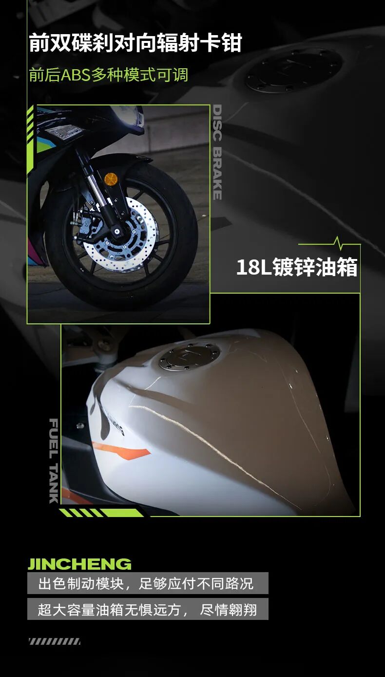 双碟盘配备辐射卡钳,并且配备前后ABS,出色的制动提供安全保障,而为了赋予车辆更多可玩性,枭250提供ABS可关闭功能,同时配有18L的超大油箱,解决续航焦虑,谁说跑车不能享受摩旅的快乐与自由。