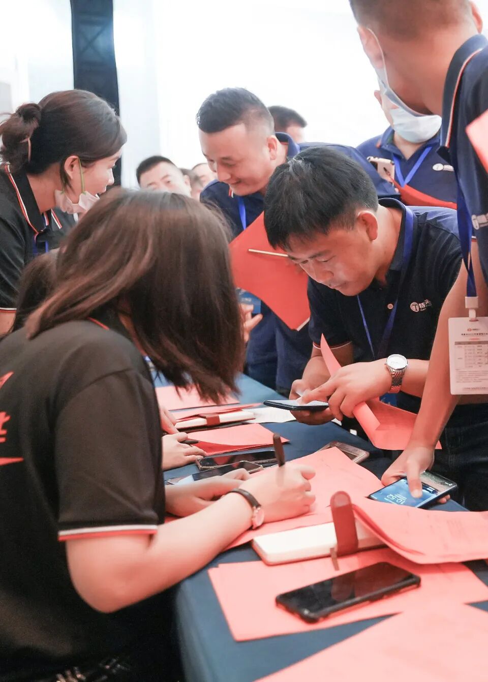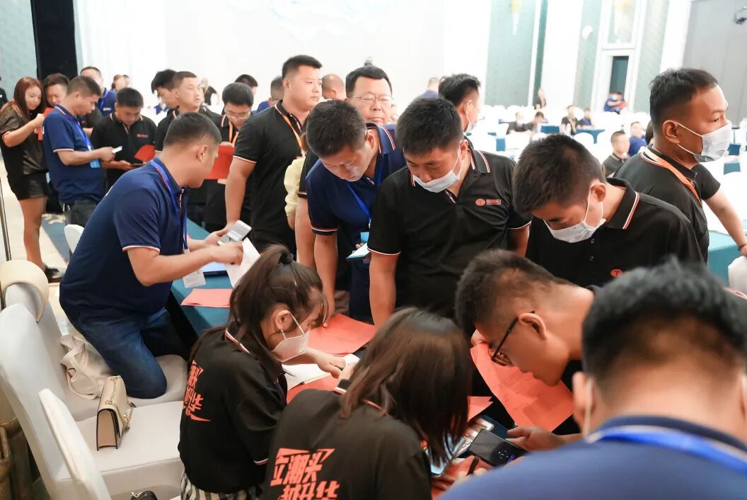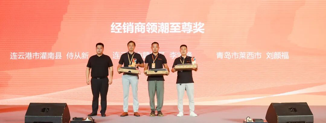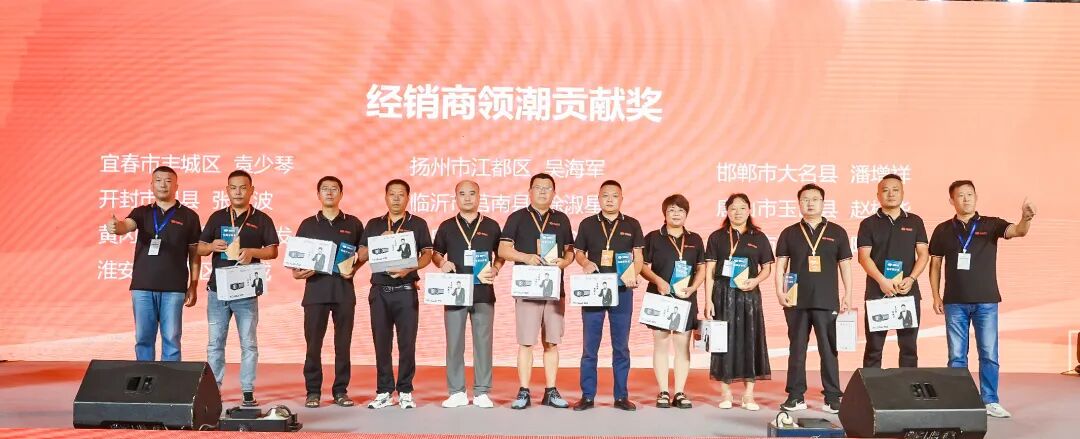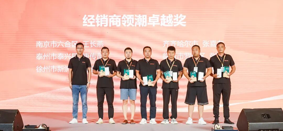 为了表达对经销商的感谢,会议对2022年上半年表现优秀的经销商进行了表彰,共计评选出经销商领潮贡献奖10位、经销商领潮卓越奖6位、经销商领潮至尊奖3位,分别由北方部销售部长王桂海、南方部销售部长姜宝,营销总监魏庆林,总经理潘天成为各位优秀经销商颁奖,并合影留念。