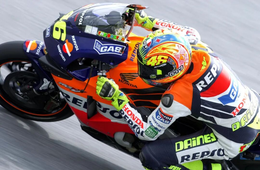 2002年,国际摩联对比赛规则作出重大修改,GP500改名MotoGP。就在当年赛季,出现了令人奇怪的一幕,即四冲程赛车与二冲程赛车同台竞技!Honda二冲程赛车NSR500在赛道上高频嘶吼、霹雳飙驰,遗憾的是,二冲程时代已经过去,同样来自Honda麾下的四冲程赛车RC211V显得更加凶悍、更具杀伤力!最终,驾驶RC211V的罗西继续胜利的脚步,以355分的高分摘取了当年的骑手冠军;Honda赛车队以绝对优势夺取了厂家冠军,比亚军足足多出了100分以上!