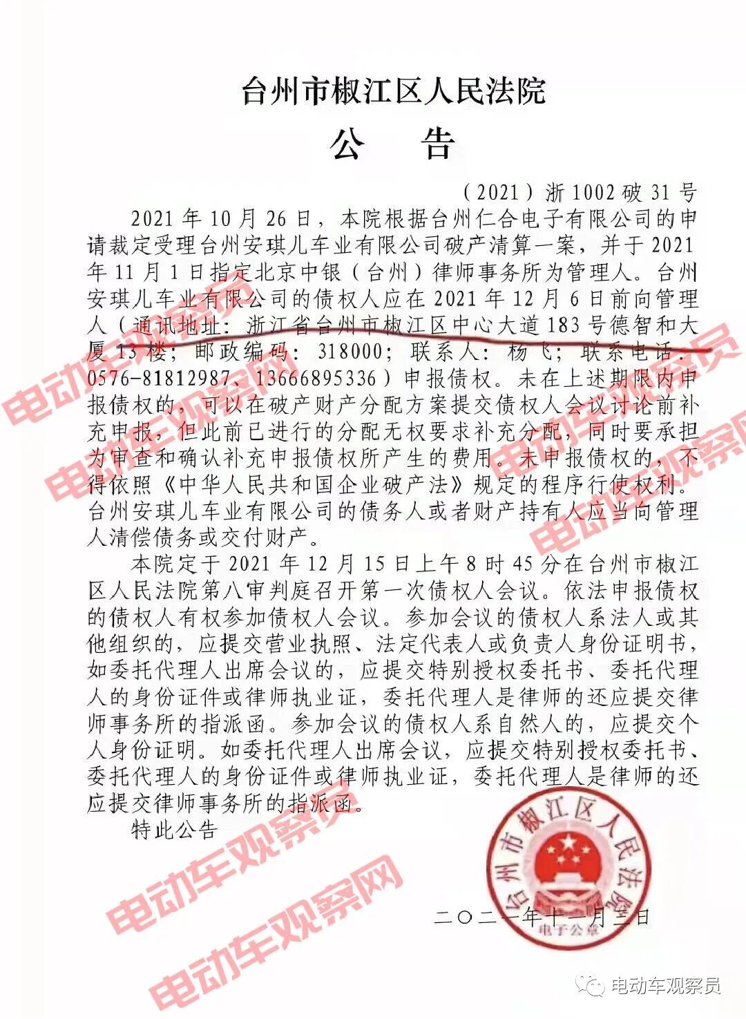 据悉,2021年11月3日,台州市椒江区人民法院发出公告,根据台州人合电子有限公司(配件企业)申请安琪儿车业破产清算。