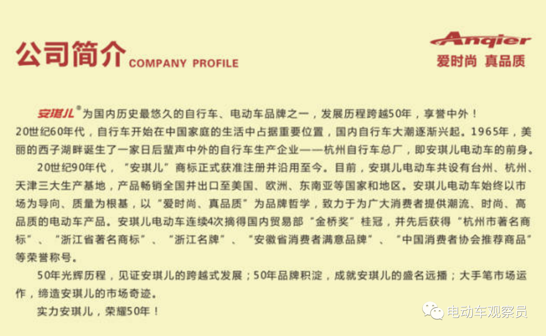安琪儿车业官微显示,前身为成立于1965年的国营杭州自行车总厂。“安琪儿”为老字号国资品牌,发展历程跨越50年,享誉中外。