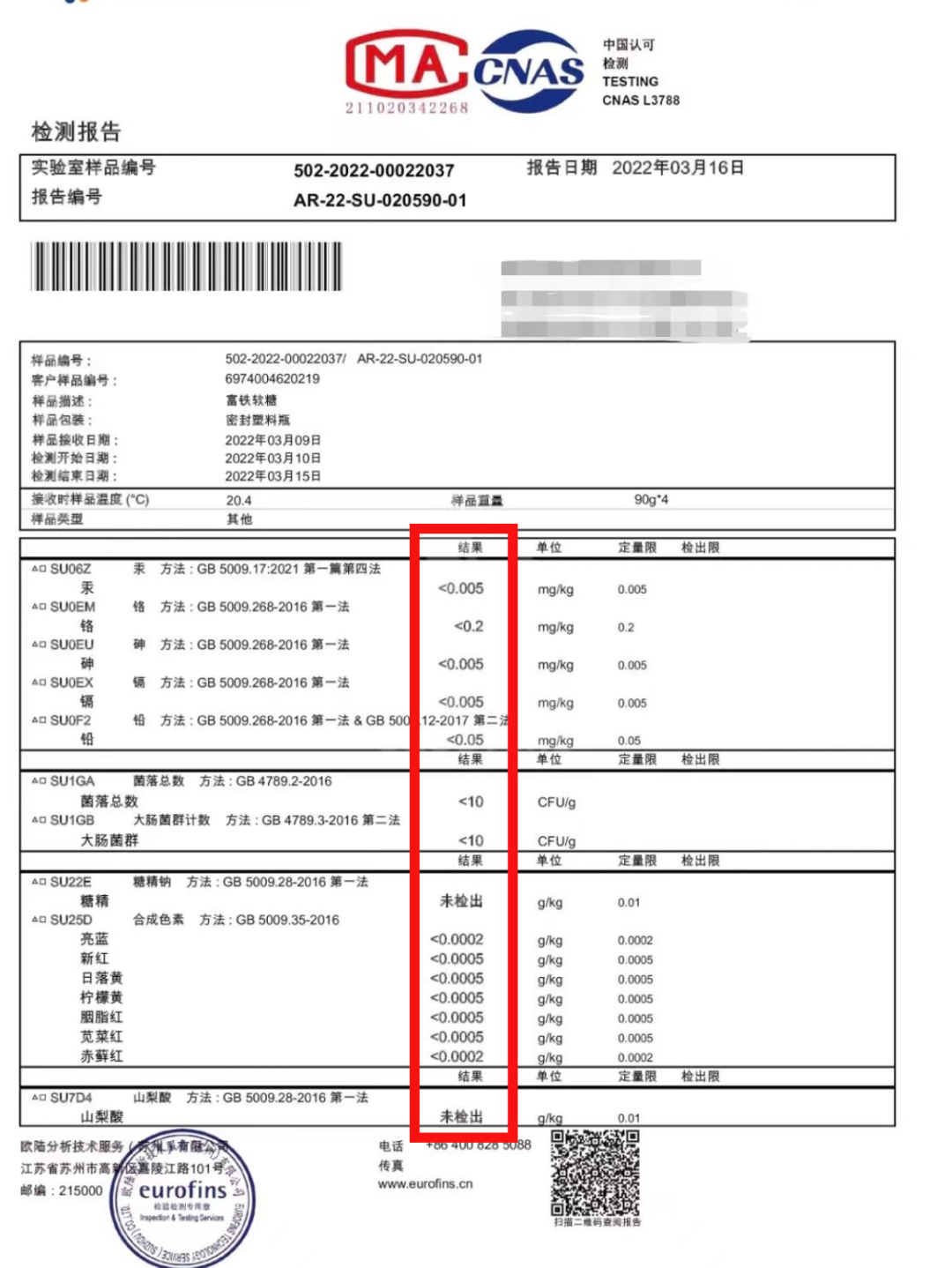 而且「解你」对自我的要求也非常严格,推出的蓝莓叶黄素酯软糖和富铁软糖,不仅通过了国标要求的基础检测: