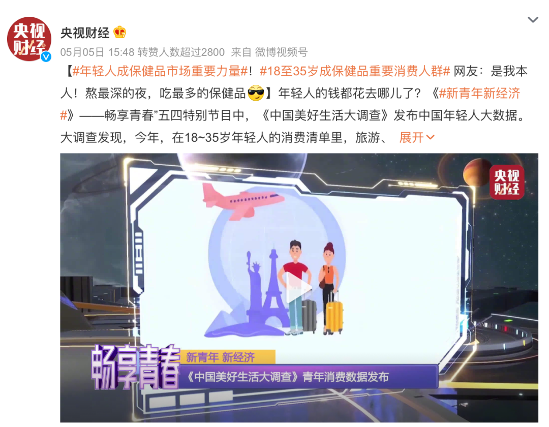 央视财经今年5月就发布了一条#18至35岁成保健品重要消费人群#的超话。