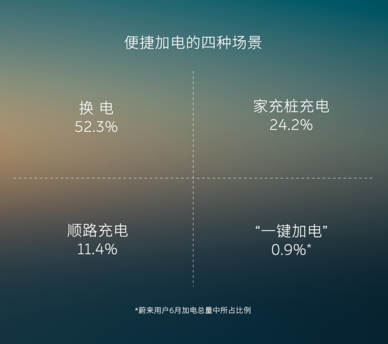 以今年6月份的蔚来用户加电量数据为例:52.3%来自换电,24.2%来自家充桩充电,11.4%来自顺路充电(比如去商场购物时随手充电),0.9%来自“一键加电”,4种加电方式加在一起占比88.8%。