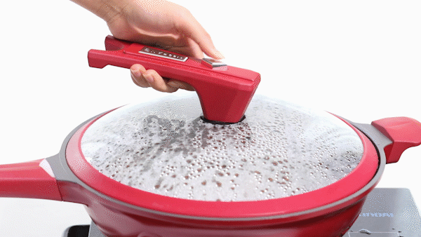 按压锅盖手柄处的泄气阀,排出锅内蒸汽,就可以轻松掀起锅盖。