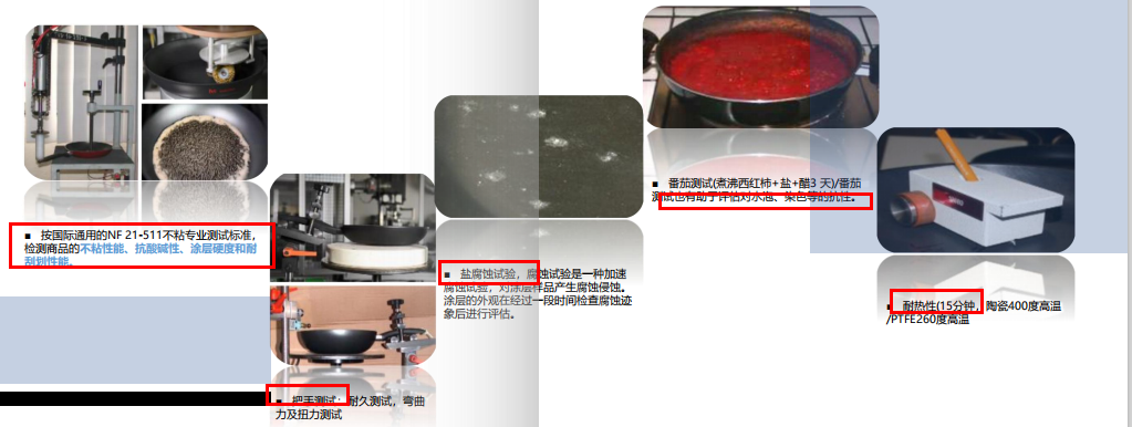 锅具出厂前经过多项检测:不沾锅测试、手把测试、盐腐蚀测试、染色测试、耐热性测试.....