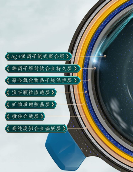 实现这一技术背后对工艺的要求十分复杂,从内到外一共有五层不同的材料组成,分别是晶相导磁层、矿物粒子导热层、高纯度铝合金层、钛介质聚能层、加固基底层。