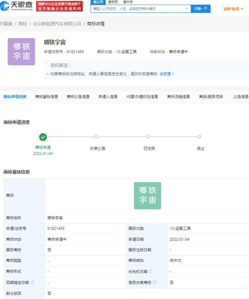 日前,哪吒汽车关联公司申请注册多项“哪吒元宇宙”“合众元宇宙”“哪铁宇宙”商标,目前正在审批中。